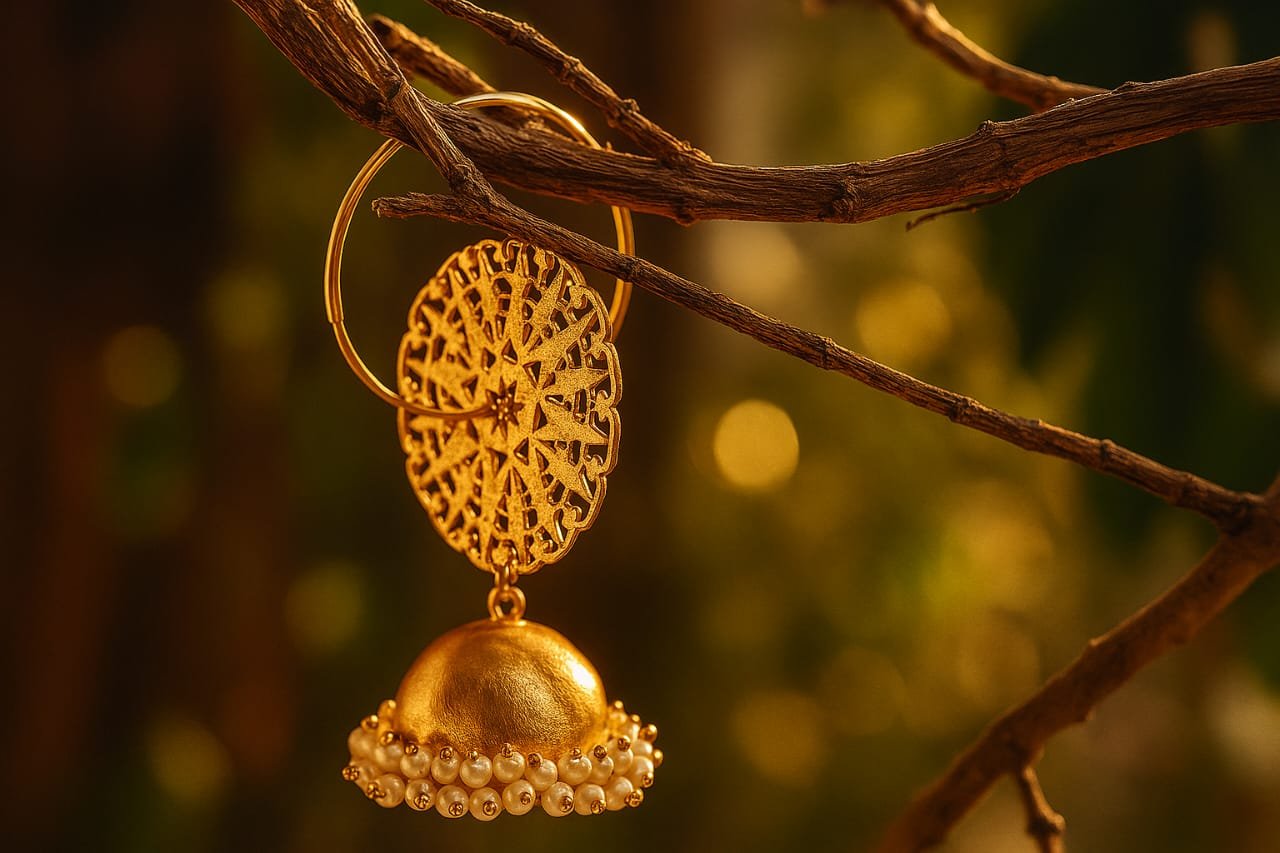 Premium brass metal.handcrafted jaal pattern detailing, doomed jhumka with pearl edging, lightweight and comfortable for extended wear with elegant movement, Anti Tarnish