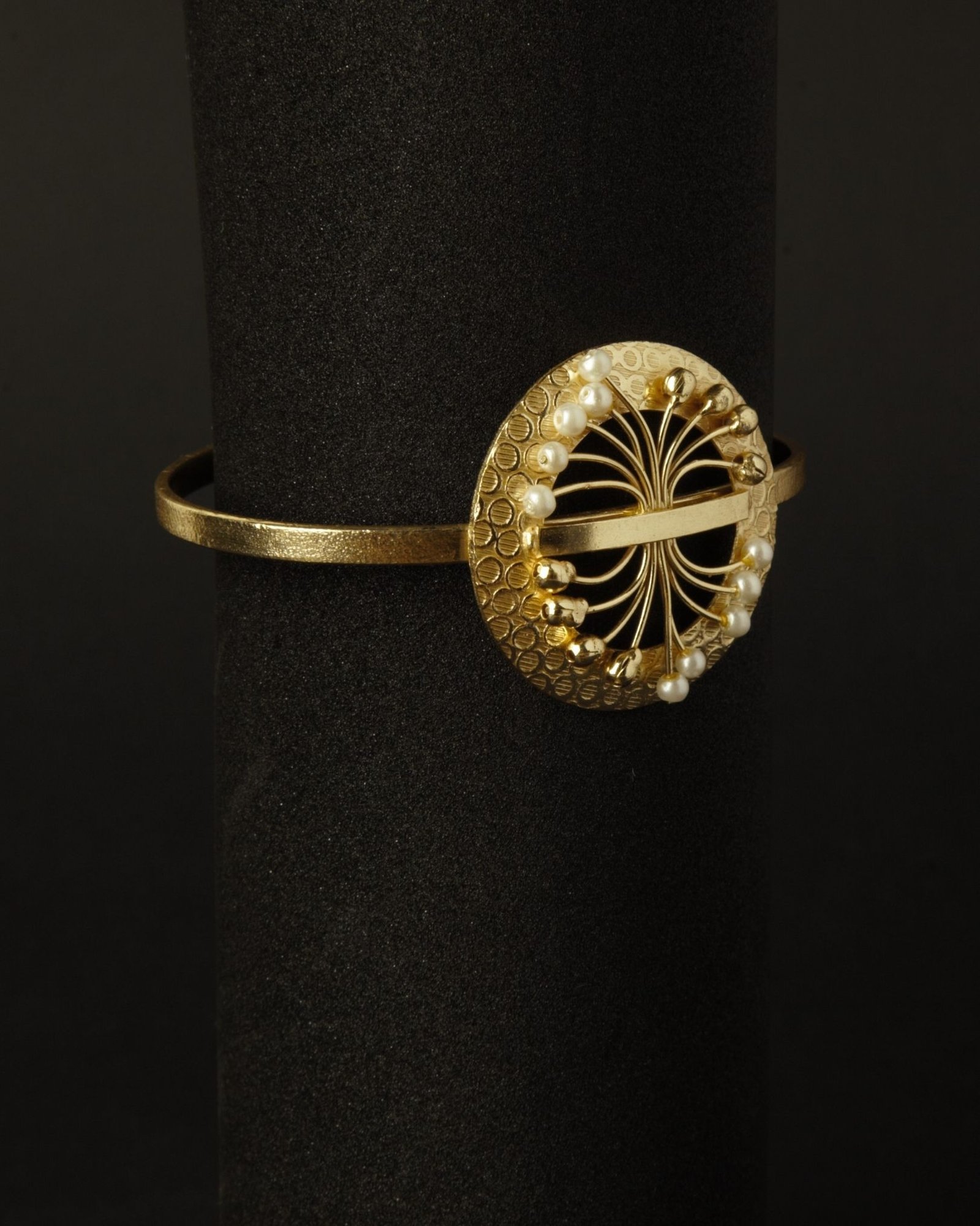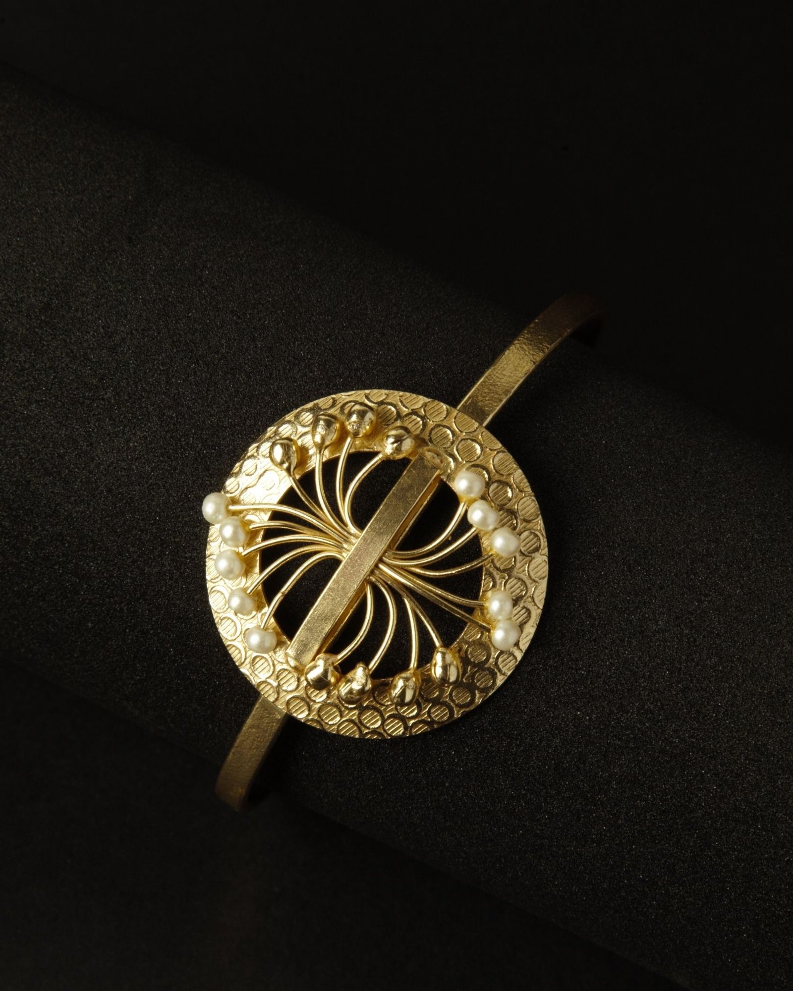 The Aurelle Pearl Radiance Hand Cuff reflects Oriyaana’s design philosophy — bold statement forms softened with refined detailing. At the center of this cuff sits a textured circular medallion inspired by radiant sunburst patterns, framed with fine metal spokes and subtle pearl accents that bring movement and grace to the design.
