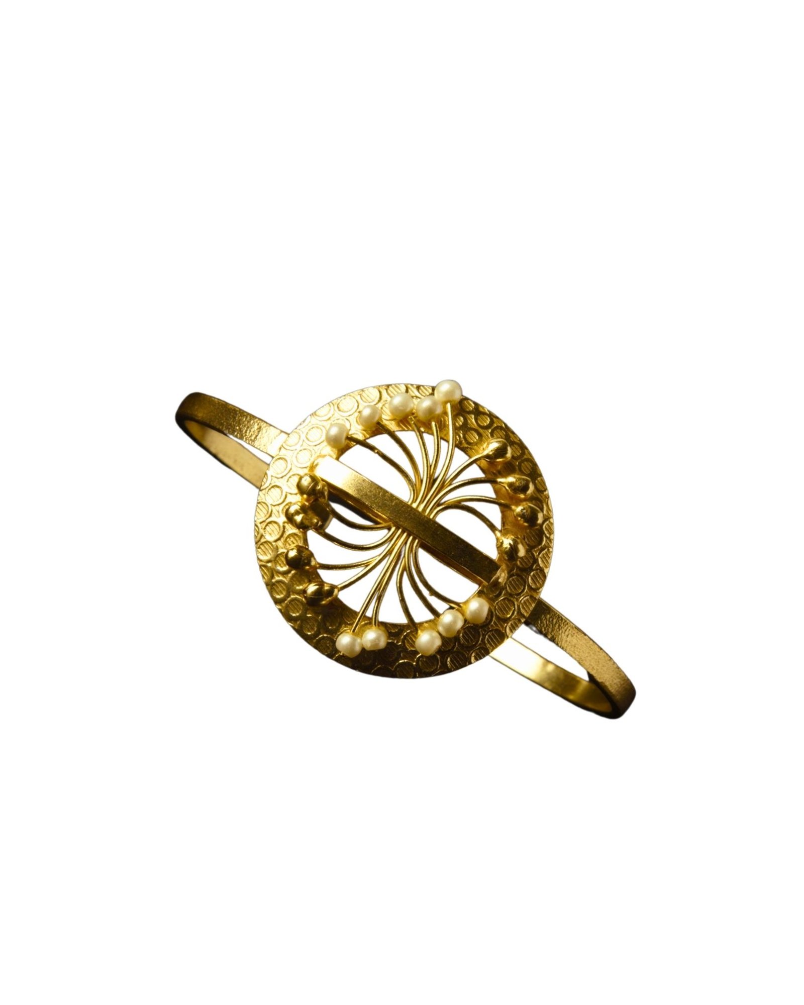 A sculptural gold-tone hand cuff featuring a radiant circular motif accented with delicate pearl detailing — designed to add effortless statement elegance to both festive and contemporary looks.