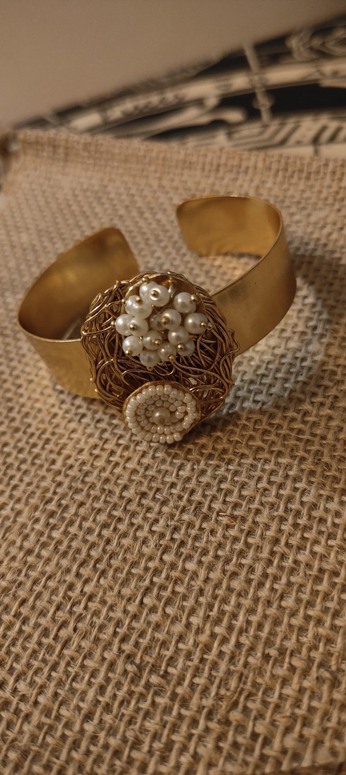 A bold gold-toned cuff featuring an intricate handwoven pearl cluster—crafted to celebrate texture, depth, and timeless elegance.