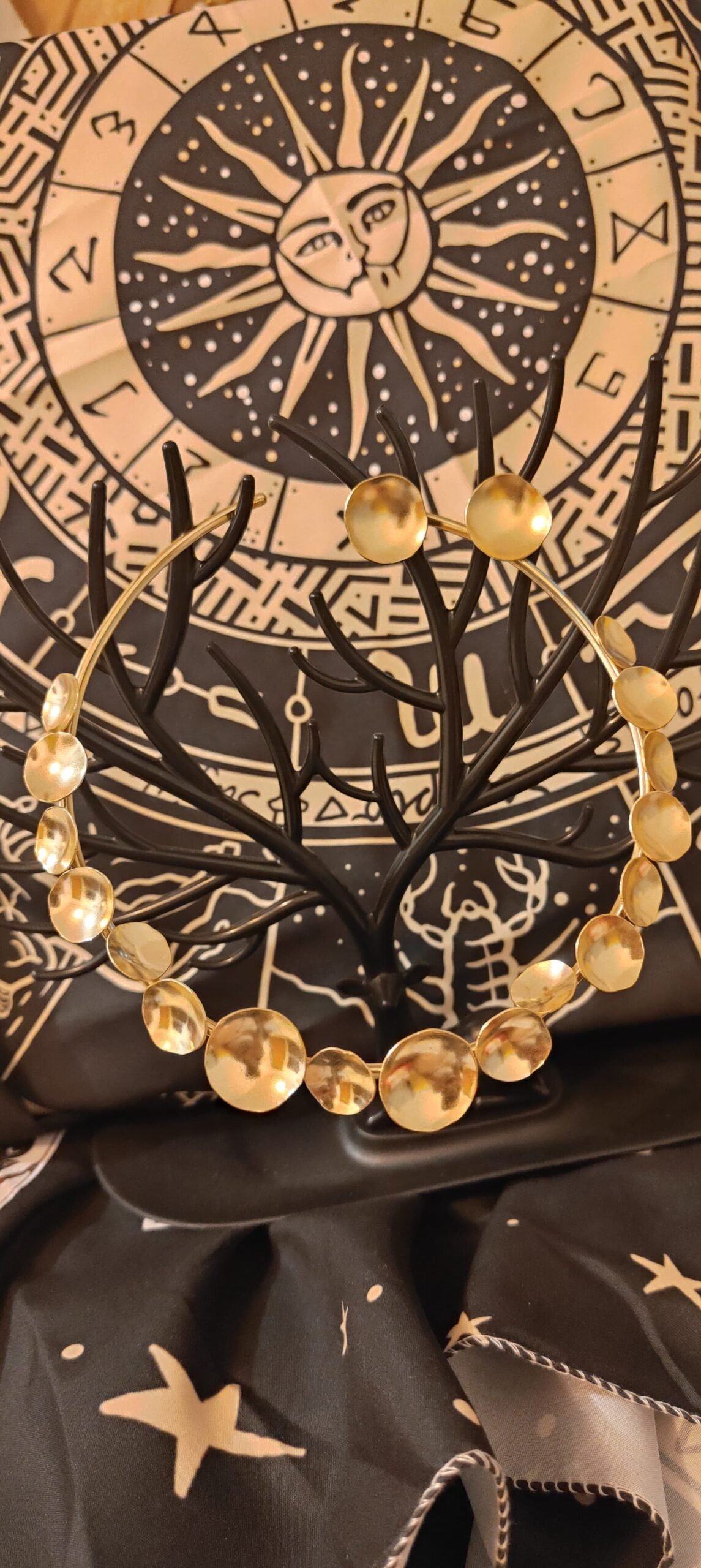 A luminous necklace set featuring polished gold-toned discs arranged in a fluid arc—crafted to reflect light, rhythm, and inner radiance.